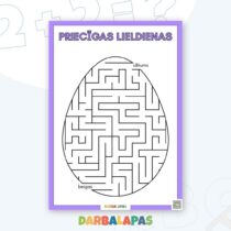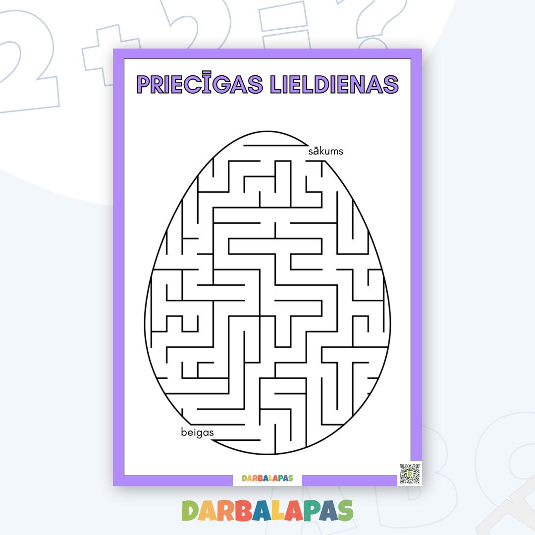 Svētkiem piemērots uzdevums – Lieldienu labirints olu formā, kur bērniem jāatrod ceļš no “sākums” līdz “beigas”. 🥚🧩